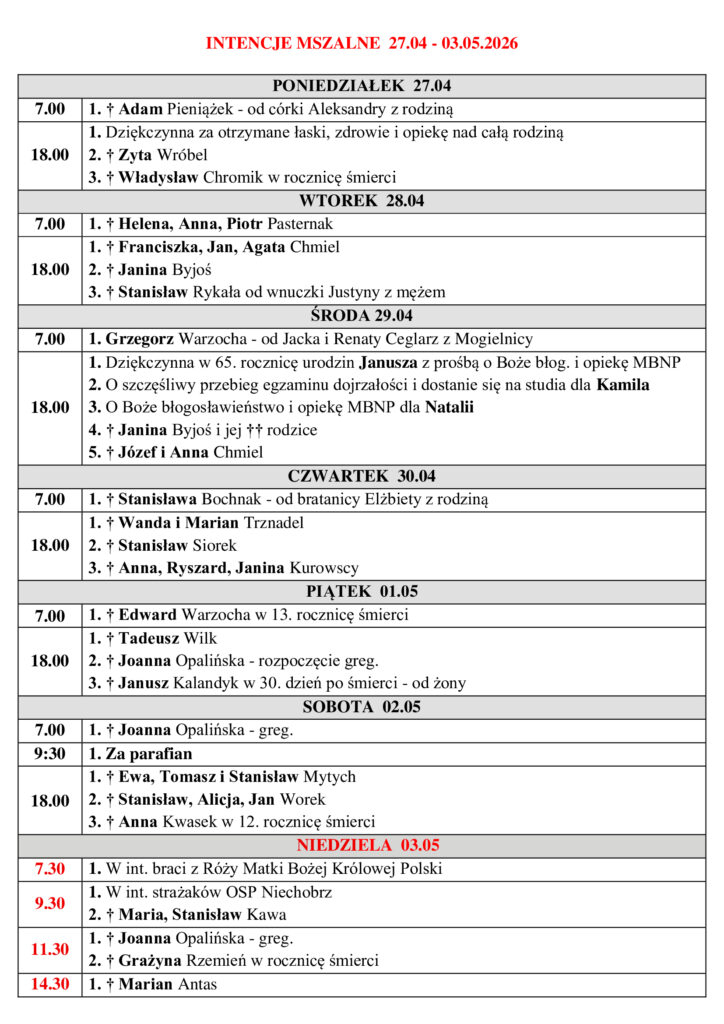 Intencje Mszy Świętych od uczestników pogrzebu za śp. Bronisław Pączek z dnia 24.04.26 r. 7 dzień po śmierci – od Beaty z rodziną – 27.04.26 r. godz. 18:00 30 dzień po śmierci – od siostrzeńca Dowiedz się więcej…