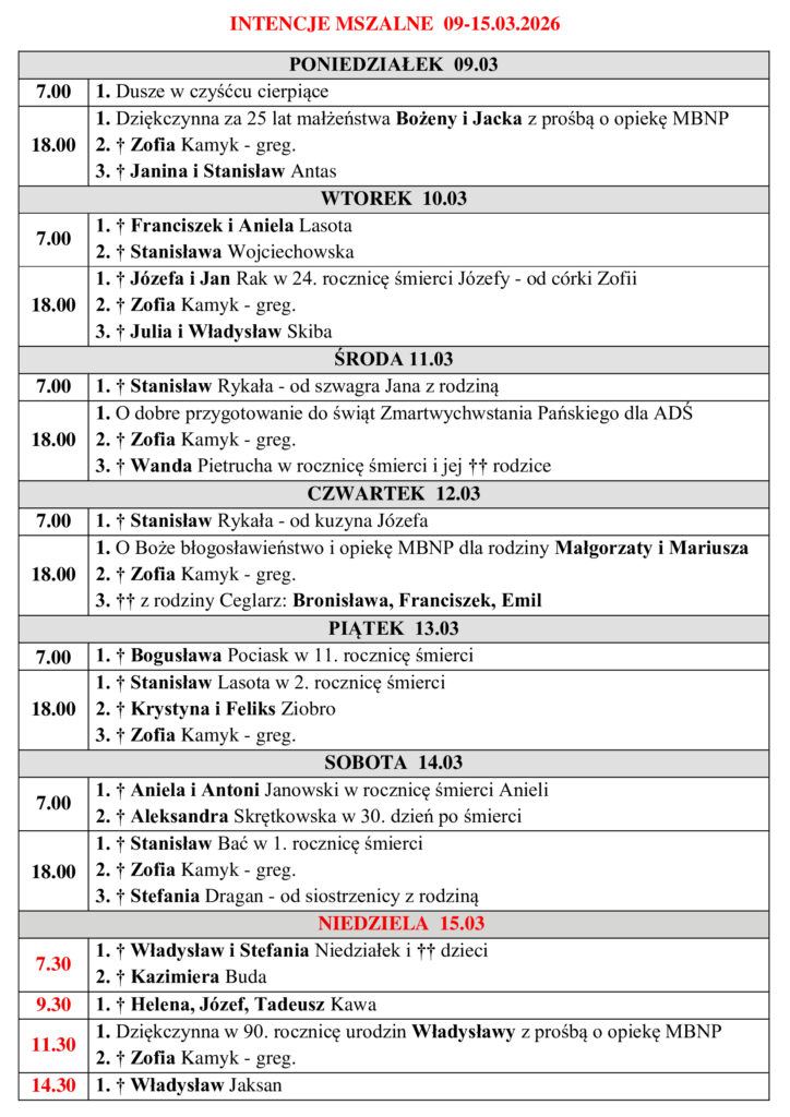 INTENCJE MSZY POGRZEBOWYCH POZA PARAFIĄ   + STANISŁAW BUDA – intencje odprawi ks. Dariusz Miąsik w Ekwadorze wraz z bpem Krzysztofem i misjonarzami z Polski Od 15.04.26r. – 12.05.26r.     + ZOFIA POCIASK – Dowiedz się więcej…