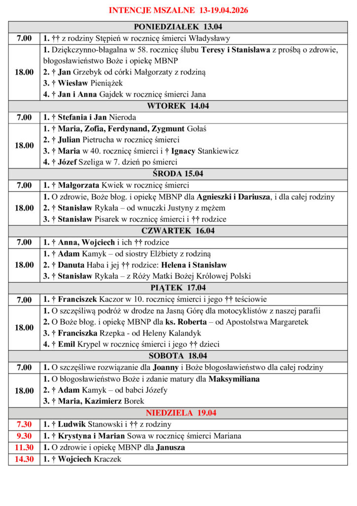 Intencje Mszy Świętych od uczestników pogrzebu za śp. Józef Szeliga z dnia 10.04.26 r. Od żony – w 7 dzień po śmierci – 14.04.2026 r., g. 18:00 Od dzieci – w 30 dzień po Dowiedz się więcej…