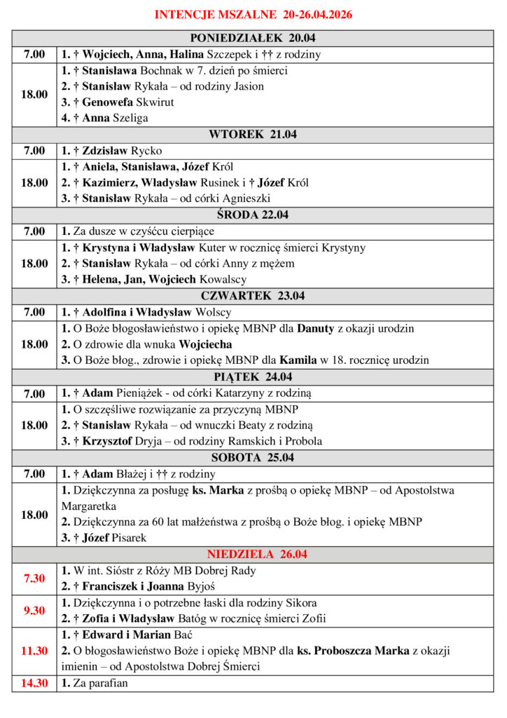 Intencje Mszy Świętych od uczestników pogrzebu śp. Stanisława Bochnak z dnia 16.04.26 r. W 7 dzień po śmierci od wnuczki z rodziną – 20.04.2026 r., godz. 18:00 W 30 dzień po śmierci od syna Dowiedz się więcej…