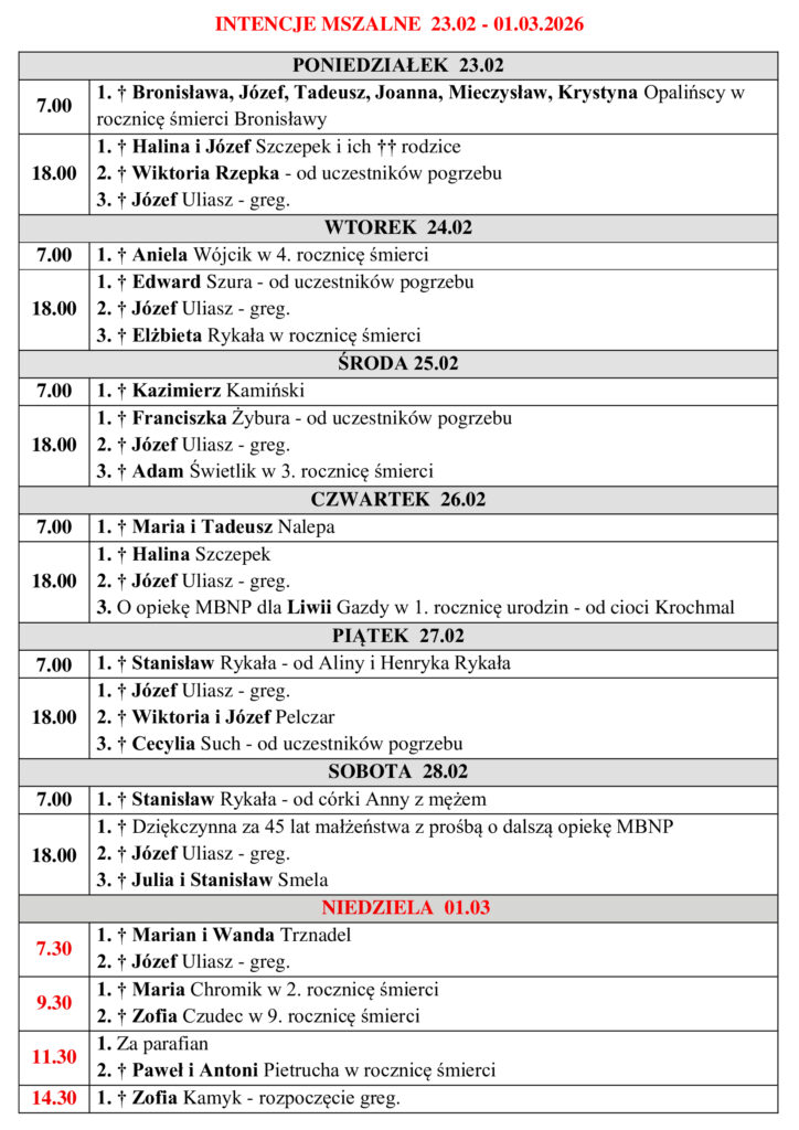 INTENCJE MSZY POGRZEBOWYCH POZA PARAFIĄ   + STANISŁAW BUDA – intencje odprawi ks. Dariusz Miąsik w Ekwadorze wraz z bpem Krzysztofem i misjonarzami z Polski Od 15.04.26r. – 12.05.26r.     + ZOFIA POCIASK – Dowiedz się więcej…