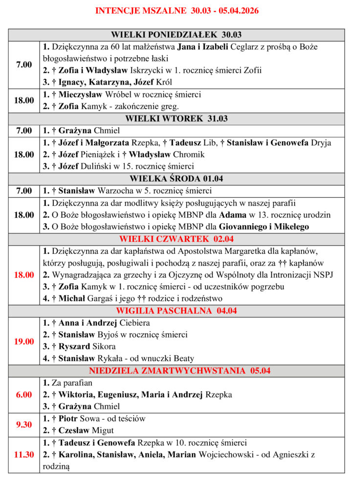 INTENCJE MSZY POGRZEBOWYCH POZA PARAFIĄ   + STANISŁAW BUDA – intencje odprawi ks. Dariusz Miąsik w Ekwadorze wraz z bpem Krzysztofem i misjonarzami z Polski Od 15.04.26r. – 12.05.26r.     + ZOFIA POCIASK – Dowiedz się więcej…