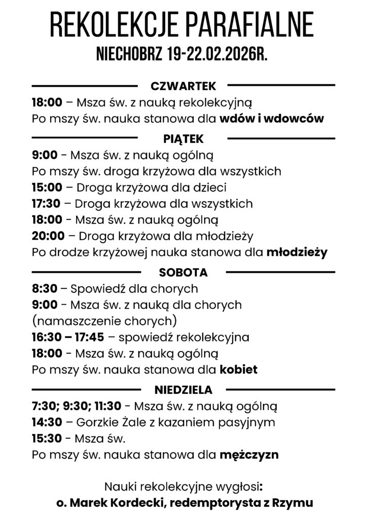 OGŁOSZENIA DUSZPASTERSKIE 6 Niedziela zwykła (15.02.26r.) Bóg zapłać za wszelkie ofiary złożone na naszą parafię, szczególnie za dzisiejszą składkę inwestycyjną. Bóg zapłać za ofiary złożone do puszek na rzecz pomocy poszkodowanym wskutek wojny na Dowiedz się więcej…