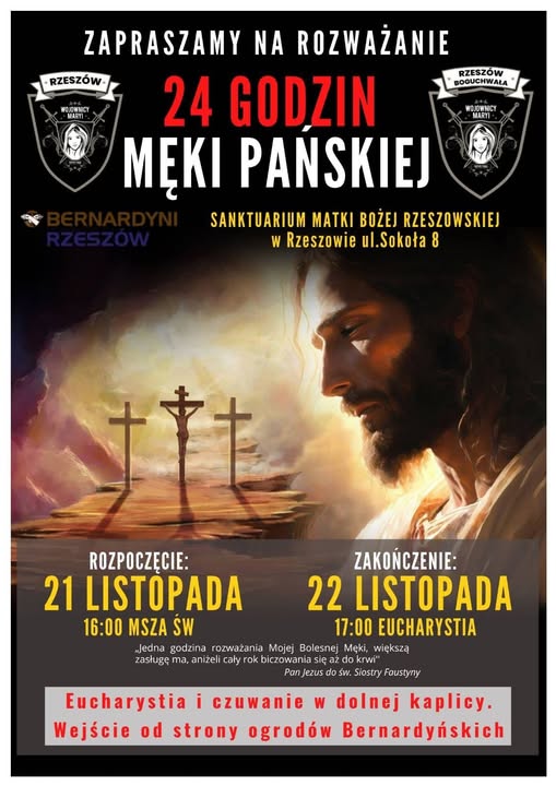 - Wojownicy Maryi zapraszają do oo. Bernardynów w Rzeszowie na rozważanie „24 godzin Męki Pańskiej” w dniach 21-22 listopada br. Szczegóły na plakacie.